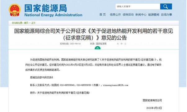 4月14日,國家能源局綜合司發布《關于促進地熱能開發利用的若干意見》(征求意見稿),提出到2025年,地熱能供暖(制冷)面積比2020年增加50%,在資源條件好的地區建設一批地熱能發電示范項目;到2035年,地熱能供暖(制冷)面積比2025年翻一番。